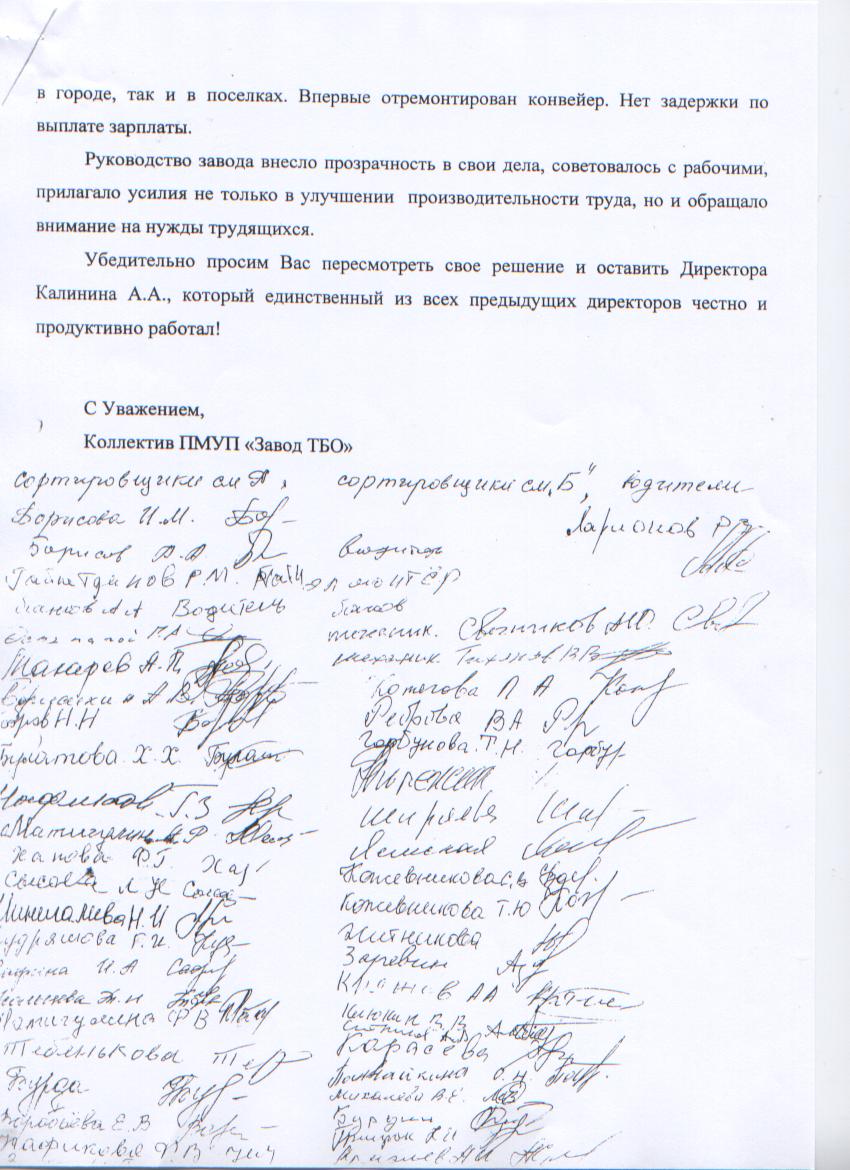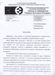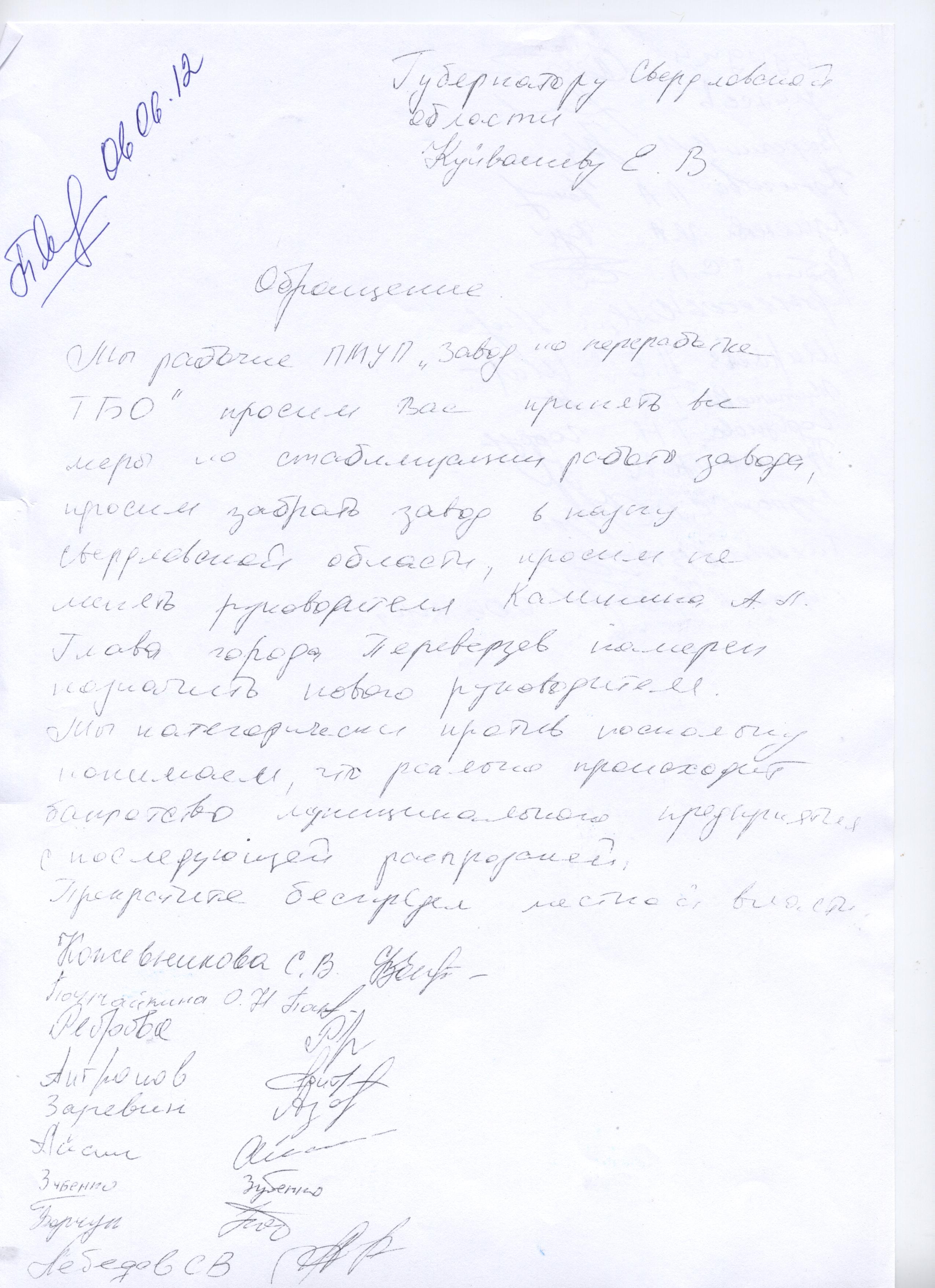 «Мы рабочие ПМУП «завод по переработке ТБО» просим Вас принять все меры по стабилизации завода, просим забрать завод в казну Свердловской области, просим не менять руководителя Калинина А.А. Глава города Переверзев намерен назначить нового руководителя. Мы категорически против поскольку понимаем, что реально происходит банкротство муниципального предприятия с последующей распродажей. Прекратите беспредел местной власти»