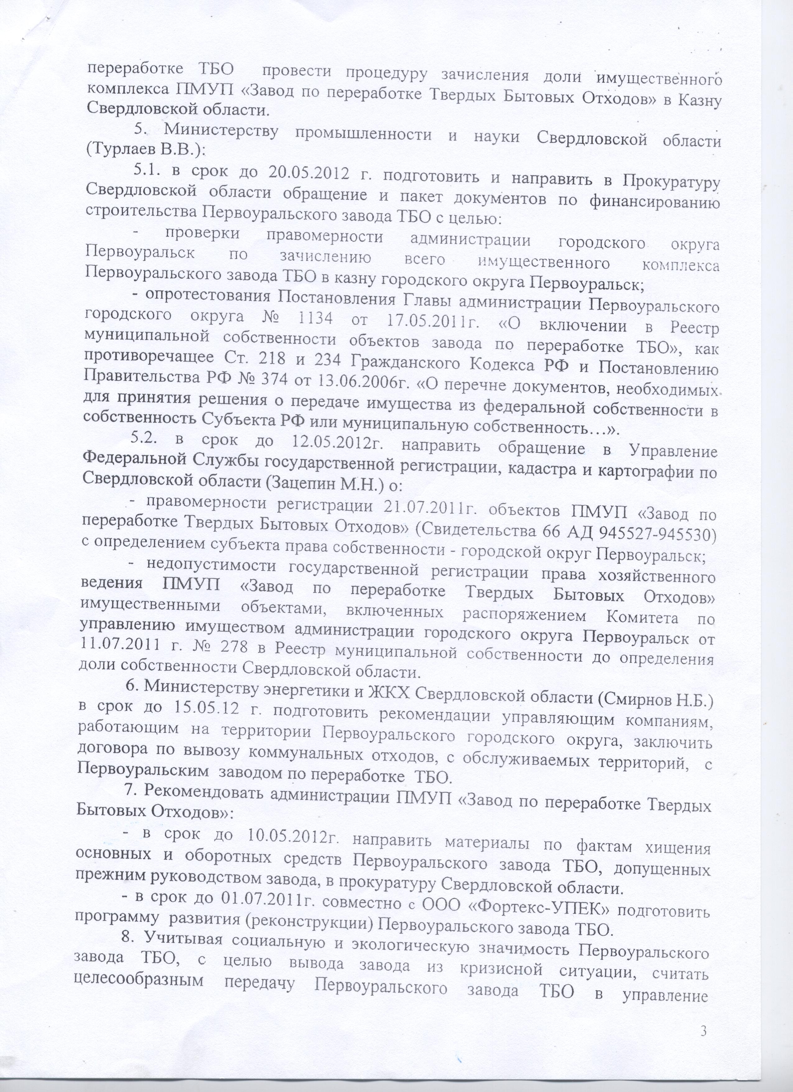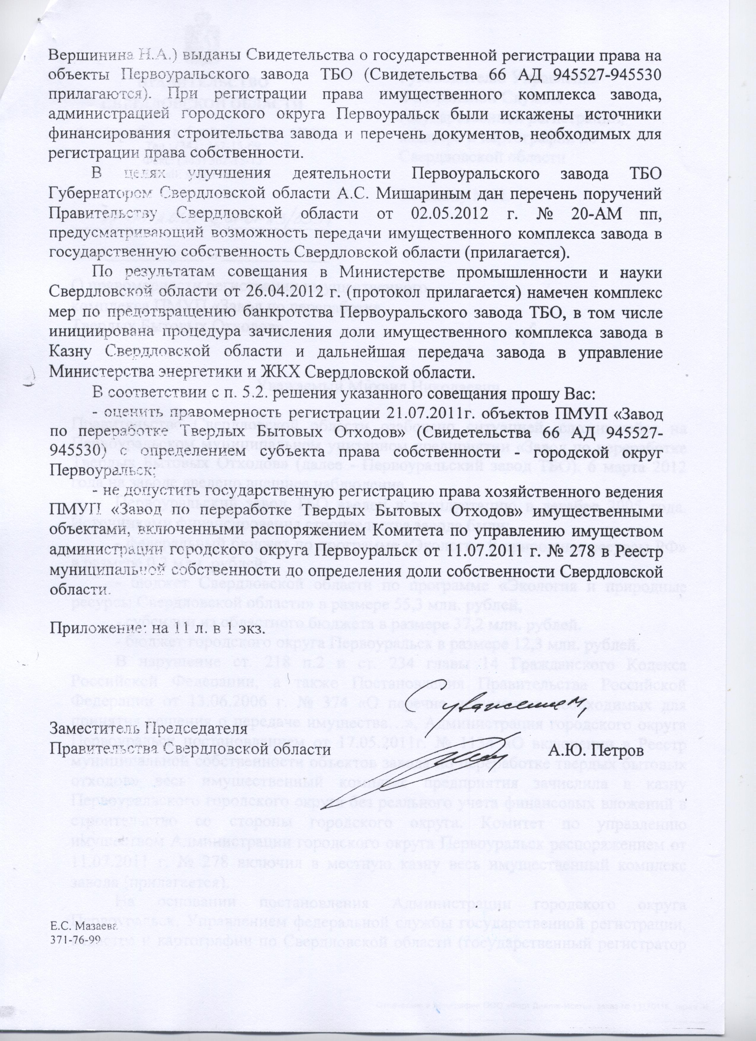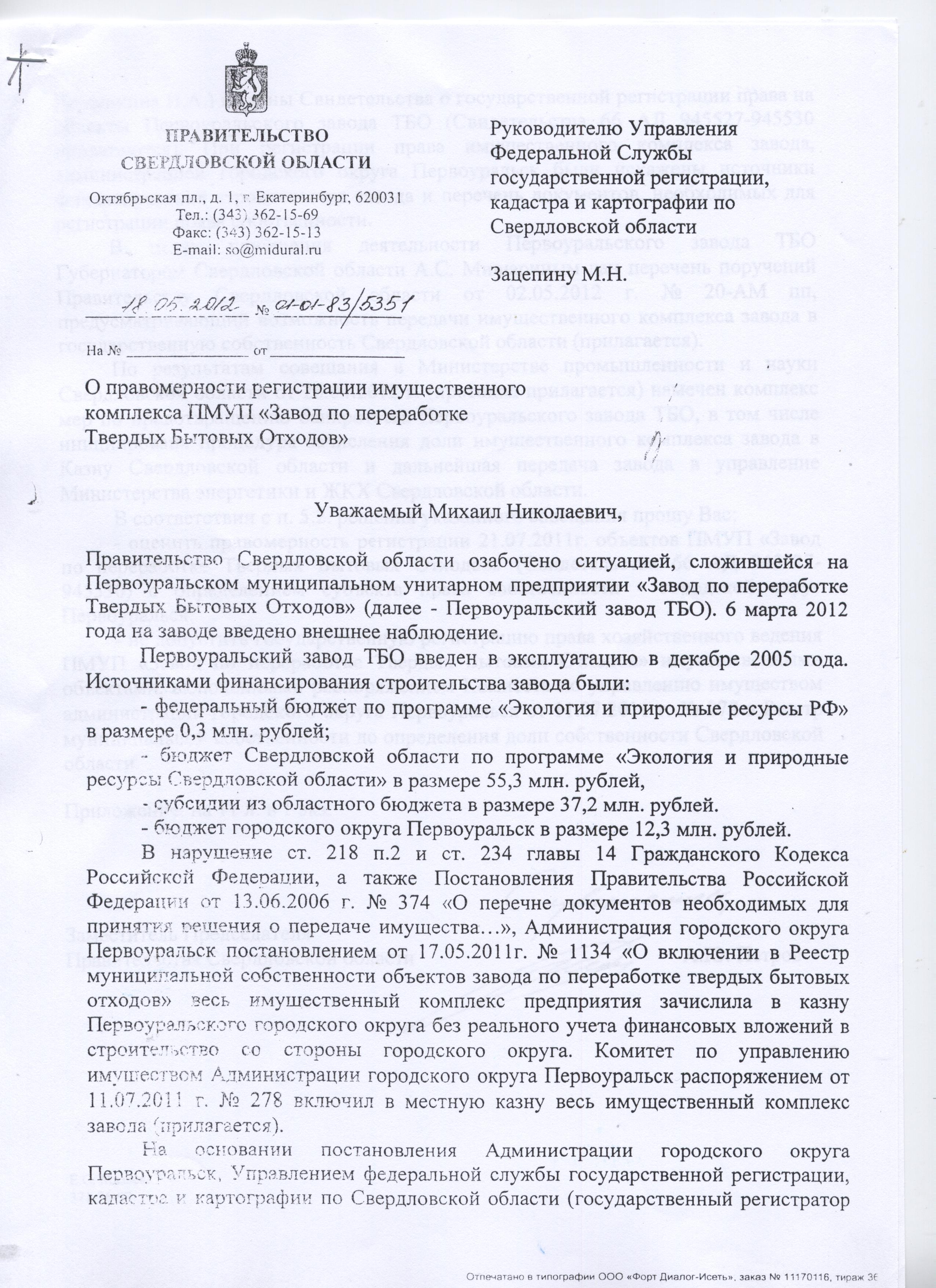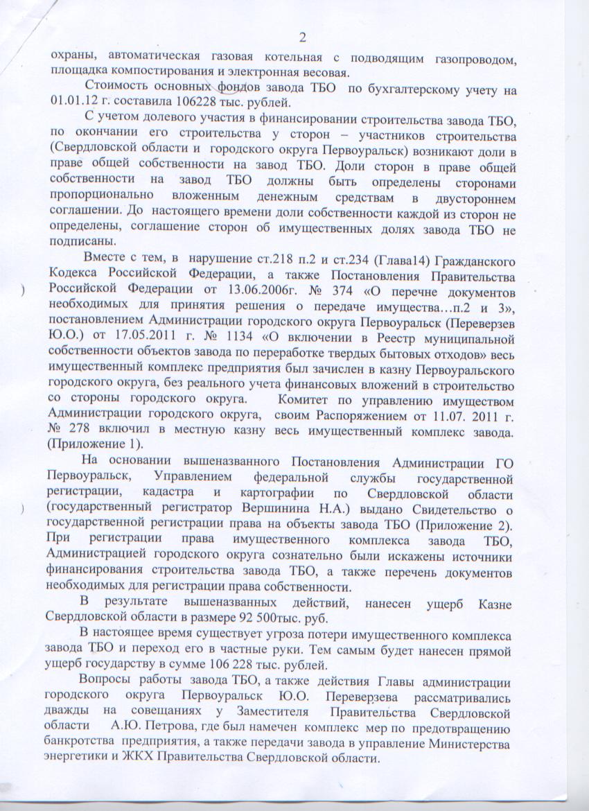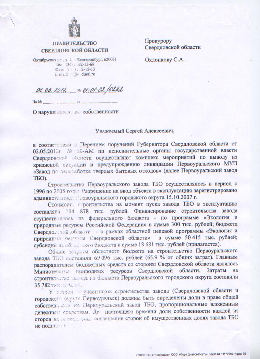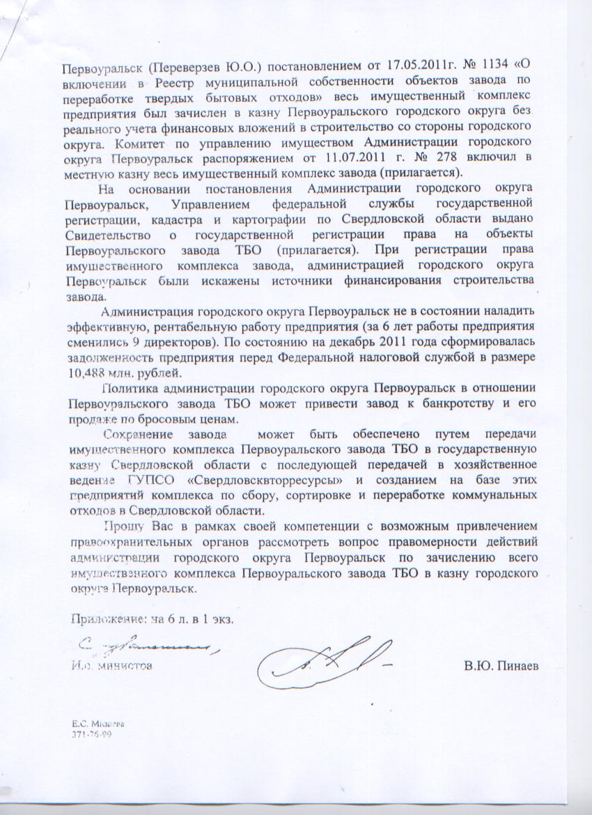 На основании вышеизложенного, прошу Вас организовать проверку законности действий администрации городского округа Первоуральск и опротестовать постановление главы городского округа Первоуральск от 17.05.2011 за номером 1134 по зачислению всего имущественного комплекса завода в муниципальную казну, а так же обратиться в Первоуральский городской суд о наложении ареста на имущественный комплекс ПМУП «завод по переработке ТБО» до определения долей собственности областного и муниципального бюджета.