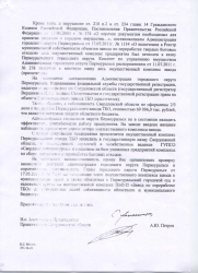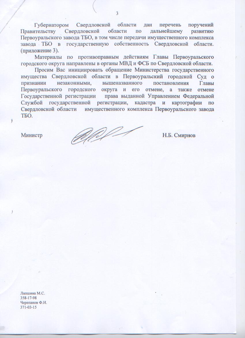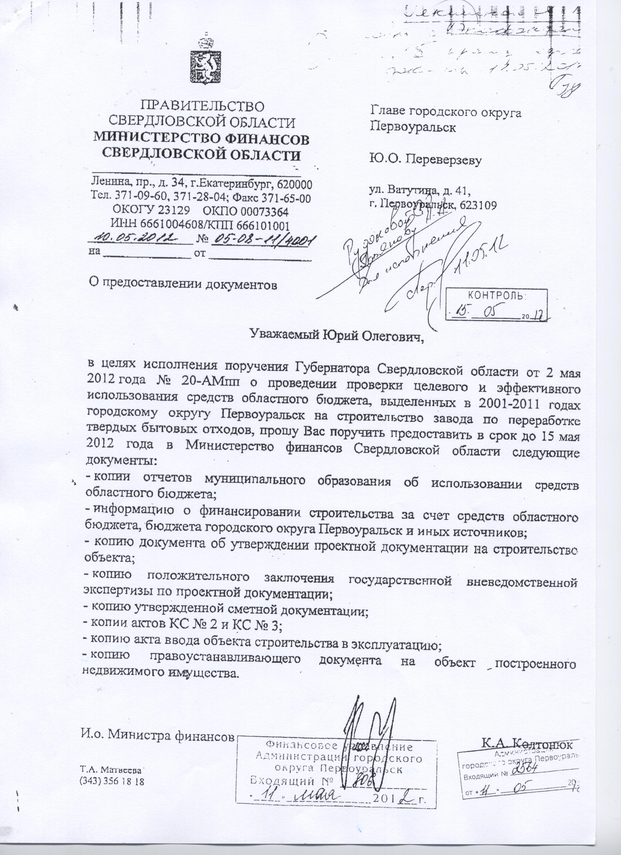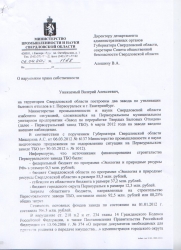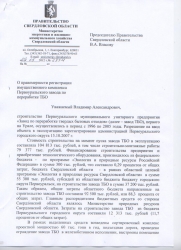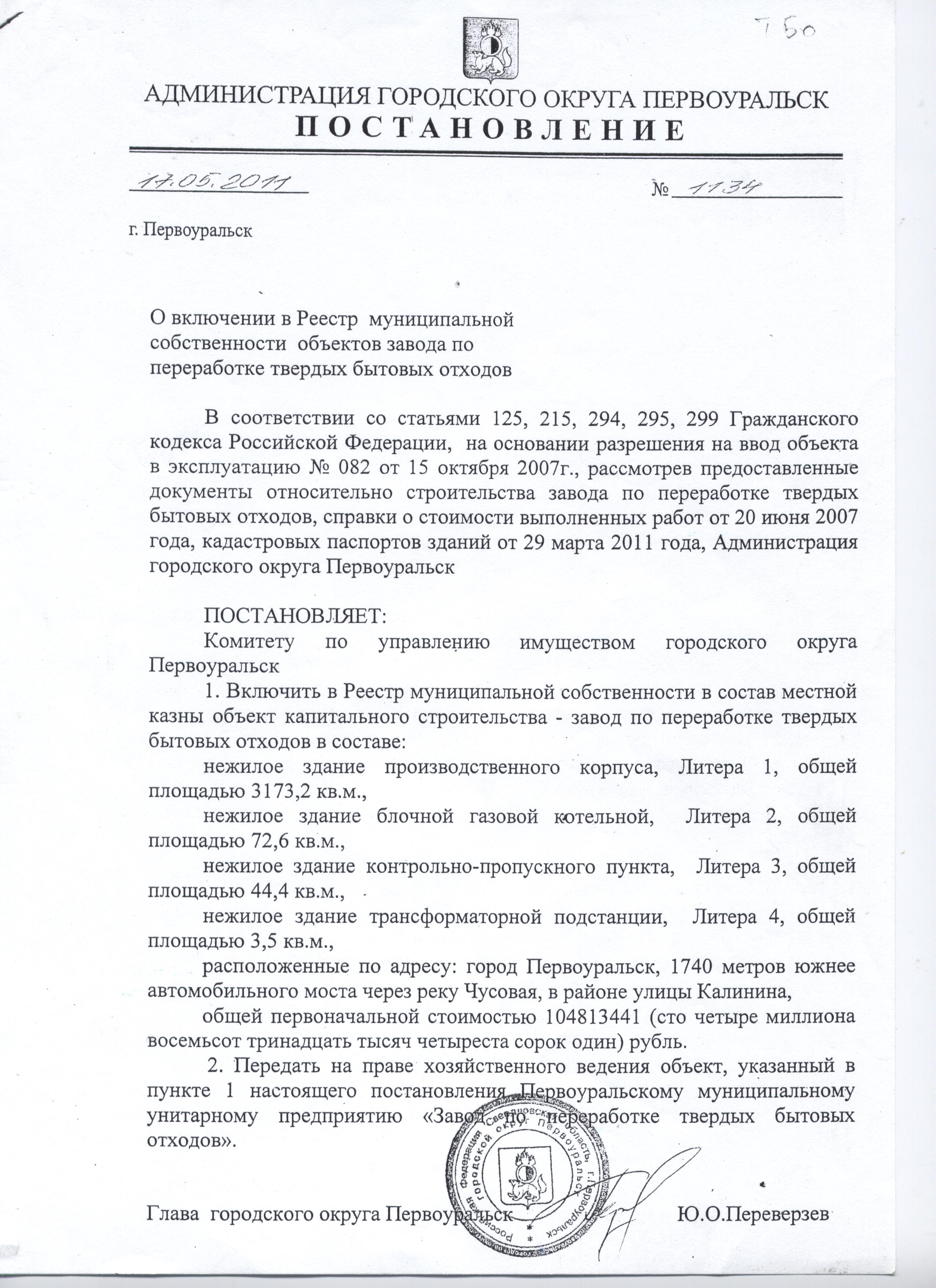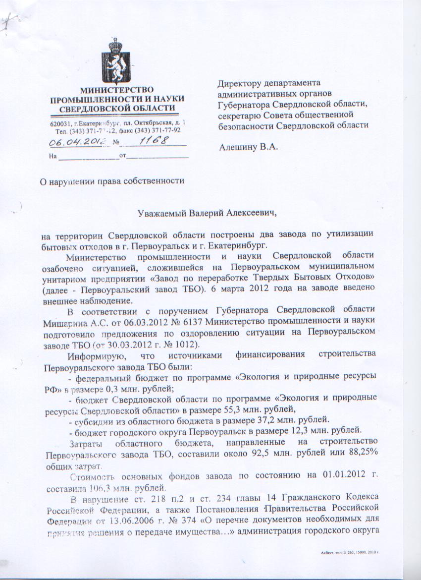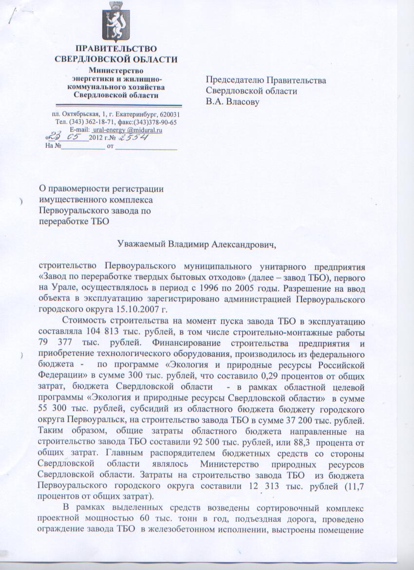 На основании вышеизложенного, прошу Вас организовать проверку законности действий администрации городского округа Первоуральск и опротестовать постановление главы городского округа Первоуральск от 17.05.2011 за номером 1134 по зачислению всего имущественного комплекса завода в муниципальную казну, а так же обратиться в Первоуральский городской суд о наложении ареста на имущественный комплекс ПМУП «завод по переработке ТБО» до определения долей собственности областного и муниципального бюджета.