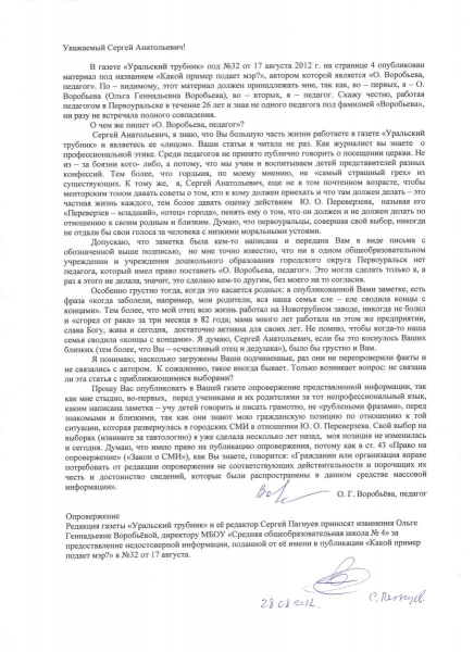 7 сентября на сайте «ОБУП», а затем 10 сентября на сайте pervouralsk.ru была распространена лживая информация о том, что редакция газеты «Уральский трубник» и её редактор Сергей Пагнуев принесли извинения Ольге Геннадьевне Воробьёвой, директору МБОУ "Средняя общеобразовательная школа № 4" за предоставление недостоверной информации. В «доказательство» представлен скан документа с жалобой в «Уральский трубник» и подписью Сергея Пагнуева о том, что он эту жалобу получил.