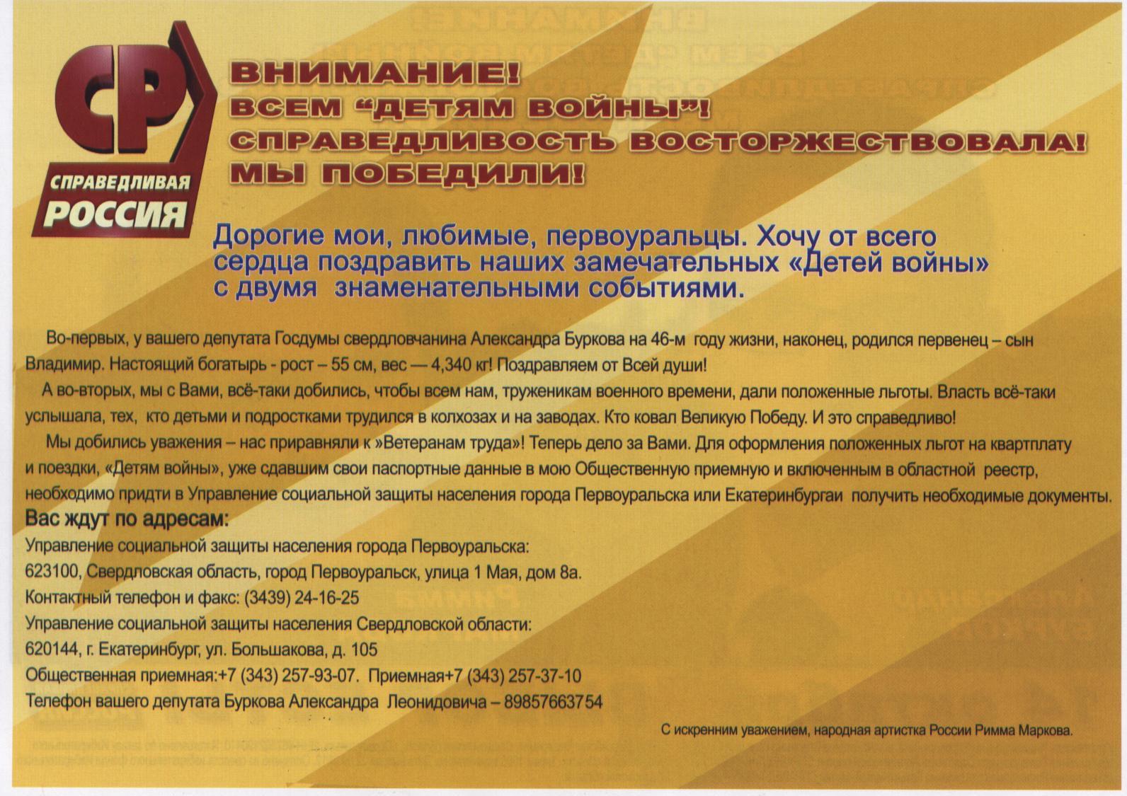 Сегодня утром по подъездам города Первоуральска была распространена листовка «ВНИМАНИЕ! Всем «ДЕТЯМ ВОЙНЫ»! Справедливость восторжествовала! Мы победили! На фотографиях – всем известные люди – лидер регионального отделения СПРАВЕДЛИВОЙ РОССИИ Александр Бурков и народная артистка РФ, член партии СПРАВЕДЛИВАЯ РОССИЯ – Римма Маркова.