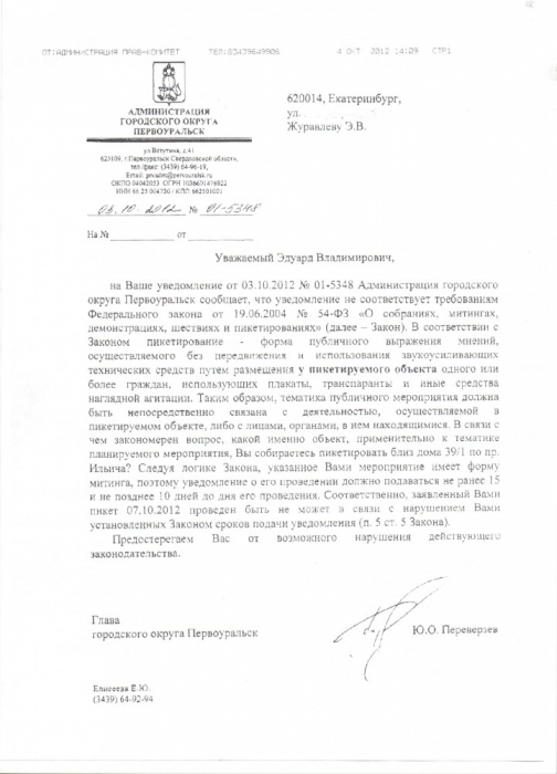 На 7 октября активисты решили устроить пикет в центре города для раздачи этой газеты и других информационных материалов. 3 октября из мэрии за подписью Переверзева главе свердловского отделения РПР-ПАРНАС Эдуарду Журавлеву пришло письмо с отказом, содержащее следующий пассаж:
