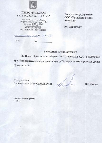Однако, как стало известно редакции перво.ру, в настоящее время О. А. Варганова (Старостина) не является помощником ни одного из депутатов Первоуральской городской Думы, в том числе и Константина Дрыгина. Полномочия ее как помощника депутата истекли вместе с первым депутатским сроком Константина Дрыгина и после этого не возобновлялись. Зачем депутат и журналистка водят жителей Самстроя за нос остается загадкой. А вот как на это смотрит закон – мы расскажем в самое ближайшее время.