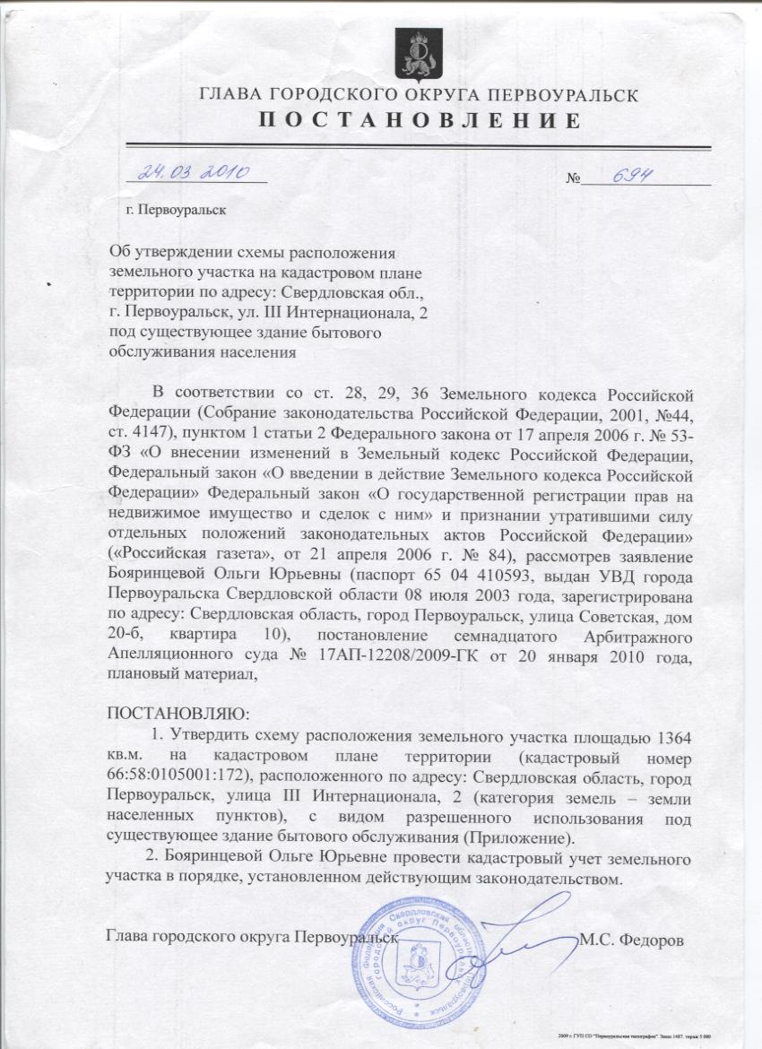 Стоит отметить, что у Бояринцевой О.Ю. есть Постановление главы Первоуральска от «24» марта 2010 года за номером 694 на данный земельный участок. Постановление и кадастровый план территории.