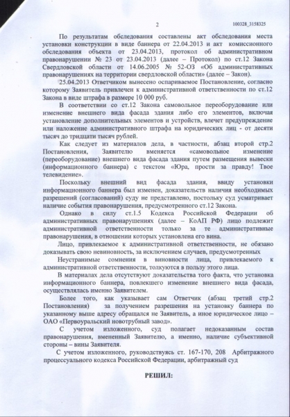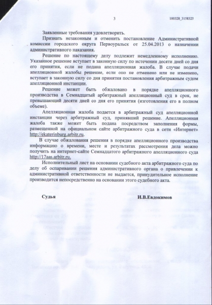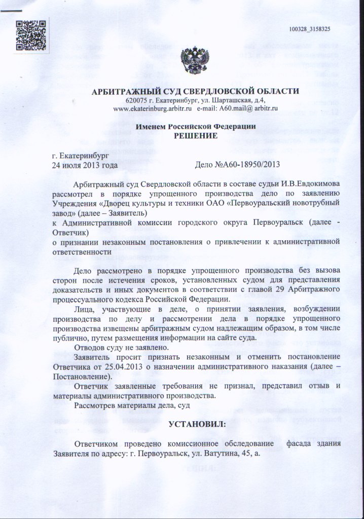24 июля 2013 года состоялся Арбитражный суд, который вынес решение, признать незаконным и отменить постановление Административной комиссии ГО Первоуральск от 25 апреля 2013 года о назначении административного наказания.