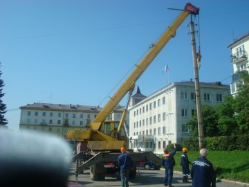 Специалисты Горэлектросети обесточивают покосившиеся бетонные опоры. Затем краном выдергивают их из земли и грузят на платформу тягача.