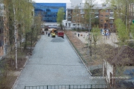 Здесь строители в прошлом году не успели провести асфальтирование дорожек и парковок. Работа кипит: выведена техника, строители укладывают щебенку… Подрядчик обещает: в течение двух недель будет завершено асфальтирование и обустройство газонов.