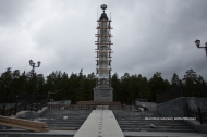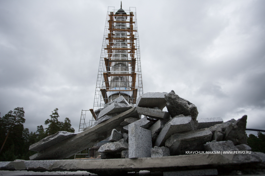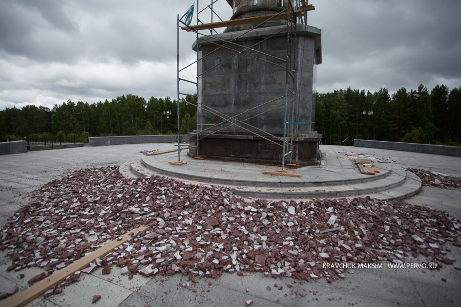 В конце мая, как только позволили погодные условия, строительные работы на территории комплекса начались. Сегодня с инспекцией на объект приехали глава администрации городского округа Первоуральск Алексей Дронов и начальник управления архитектуры и градостроительства Константин Гартман. Строители уже приступили к облицовке тела колонны. Задача № 1 выполнена: цвет новых композитных панелей полностью совпал с цветом изначальной отделки: