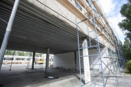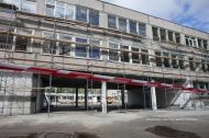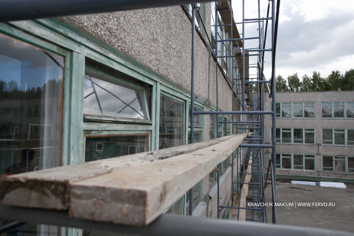 Руководство школы уже просмотрело эскизы решения фасада и предлагают немного изменить сам цвет: сделать красный не ярко-кумачовым, а чуть более темным и приглушенным. Подрядчик ждет окончательного решения. Пока, до покраски, ведется ремонт межпанельных швов фасада и частично ремонт штукатурки. Также будут отремонтированы двери, крылечки, отмостки.
