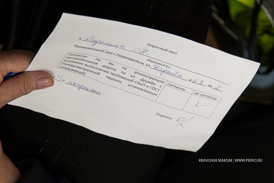 К финалу обсуждения стало ясно: собравшихся устроит только один ответ – реконструкции не будет. Этот вывод подтвердили и результаты голосования, проведенного под занавес собрания. Присутствующим раздали заранее заготовленные бланки, в которых надо было отметить, согласен или не согласен конкретный житель улицы Дружбы с ее реконструкцией, включающей снос строений капитального и некапитального характера.