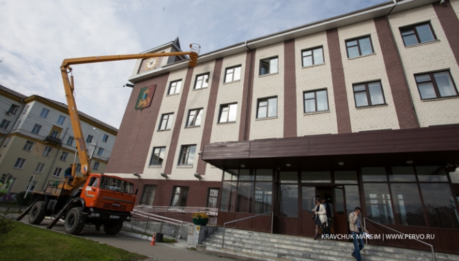Замену символов города, области и страны проводили с помощью специальной техники МПО ЖКХ. Флаги на здании администрации Первоуральска меняют два раза в год: весной и осенью – именно столько составляет срок службы флагов.