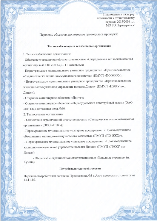 Первоуральск получил от Федеральной службы Уральского управления паспорт готовности к отопительному сезону 2015-2016 года. Это обязательный документ, позволяющий муниципальному образованию получать энергоресурсы в течение отопительного сезона. Теперь все котельные, дома, тепловые сети полностью готовы к зиме.