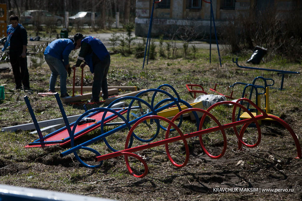 Пока рабочие устанавливают турники, брусья, баскетбольные кольца, вокруг суетятся школьники от мало до велика. Второклассник Вова Беленко утверждает: