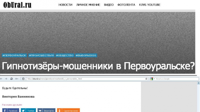В середине июля этого года издание «Общественная безопасность — Урал» выпустило материал под названием «Гипнотизеры-мошенники в Первоуральске?». В статье, написанной от имени Виктории Ванниковой, рассказывалась душещипательная история о старушке, которую якобы обокрали гипнотизеры, работающие под видом агитаторов. Автор статьи утверждает, что и сама столкнулась с сомнительными агитаторами, якобы представлявшимися партией «Единая Россия». Плюс к этому кто-то расклеил по Первоуральску объявления — мол, горожанам следует быть бдительными и не общаться с агитаторами.