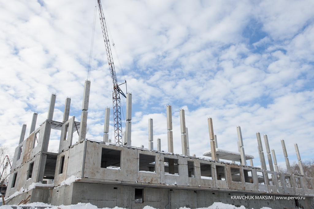 В микрорайоне Динас на строительной площадке, где ведется возведение сразу трех домов, снова появились строители, начали работу краны.