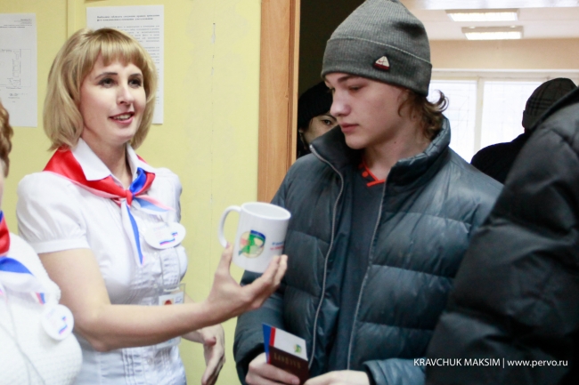 В этом году тем людям, кто в первый раз пришел отдать свой голос за того или иного кандидата и партию, дарят кружки. Вручают их председатели участковых избирательных комиссий.