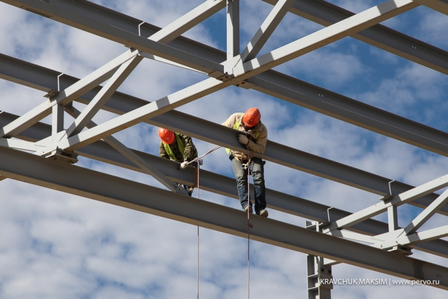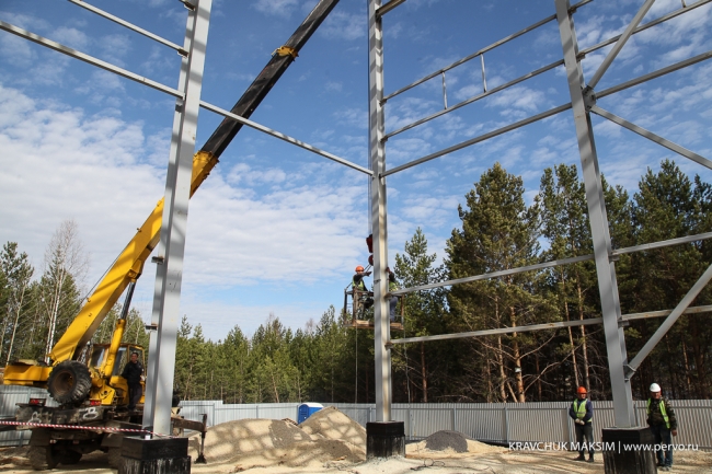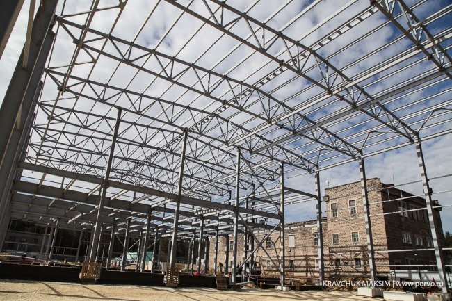 В настоящее время собран металлический каркас здания и завершается его монтаж. Завершаются работы по гидроизоляции фундаментов, идет подготовка к монтажу ленточных фундаментов. Следующим этапом будет выполняться монтаж полов и перекрытий, монтаж сэндвич-панелей и огнезащита каркаса.