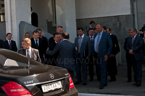 Встреча членов Президиума возле здания Заводоуправления. Приезд губернатора Свердловской области А.С. Мишарина