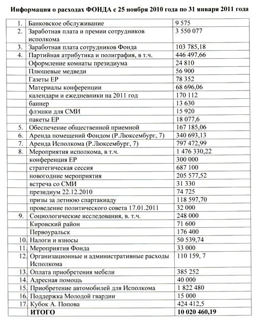 Партийный кошелек «Единой России». По его словам, в документе указаны расходы, которые совершает Свердловский региональный фонд на «Единую Россию». Графа «ИТОГО» составила более 10 миллионов рублей.