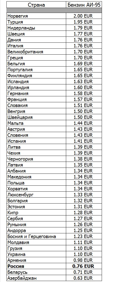 Итак, как видим из составленной экспертами таблицы, среди европейских стран самый дорогой бензин в Норвегии, где 95-ый бензин стоит два евро за литр. А вот страны СНГ в таблице стоят на последних позициях, так как имеют очень низкие по европейским меркам цены. Однако эксперты напоминают, что доходы тех же норвежцев и россиян или белорусов с украинцами несопоставимы, ведь скандинавские страны имеют высокие заработные платы в отличие от стран СНГ, а значит сравнивать стоимость нельзя.