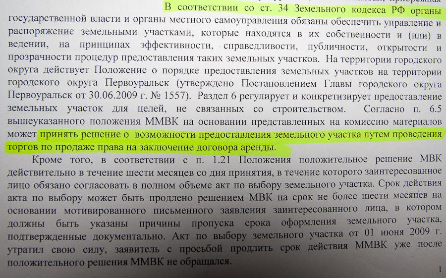Ввиду того, что земельный участок не передан в аренду, заключение ММВК не является правоустнавливающим или правоудостоверяющим документом, прокуратурой 29.12.2012 главе ГО Первоуральск Переверзеву Ю. О. объявлено предостережение о недопустимости нарушения федерального законодательства».