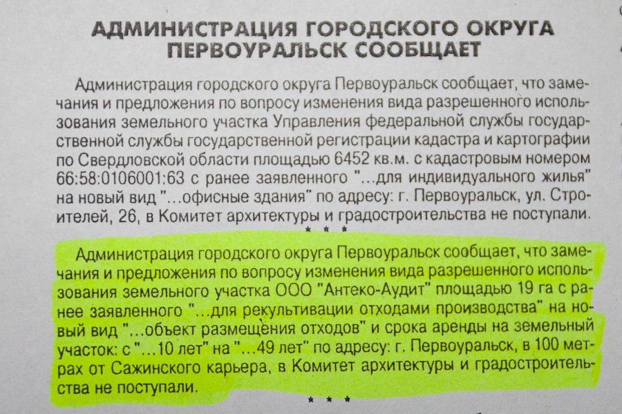 «Изначально, в официальном объявлении, опубликованном администрацией ГО Первоуральск в муниципальной газете, речь шла о том, что «Земля предоставляется в аренду сроком на 10 лет для рекультивации отходами производства по адресу г. Первоуральск, в 100 метрах от Сажинского карьера, - пояснил депутат в своем докладе, - Однако буквально полтора месяца спустя в той же газете «Вечерний Первоуральск» появляется объявление иного содержания, из которого следовало, что администрация города изменяет вид разрешенного использования земельного участка с ранее заявленного «для рекультивации», на новый вид «объект размещения отходов» и срока аренды с 10 лет на 49.