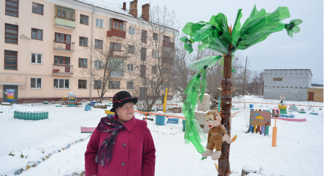 В Первоуральске местная жительница пошла дальше – своими руками она соорудила детскую площадку. На площадке стоит пальма из пластиковых бутылок, на пальме сидит плюшевая обезьяна. Клумбы сделаны из старых автомобильных покрышек – помогали с клумбами местные «выпивохи». «Подхожу к алкоголикам и спрашиваю: «Ребята, вы же наш двор любите?» «Любим», – отвечают. Показала им на покрышки, дала по ножу и показала на покрышки, дескать, вырежьте мне в них отверстия, а я в конце ряда вам сто рублей положу. Два ножа поломали, но вырезали».