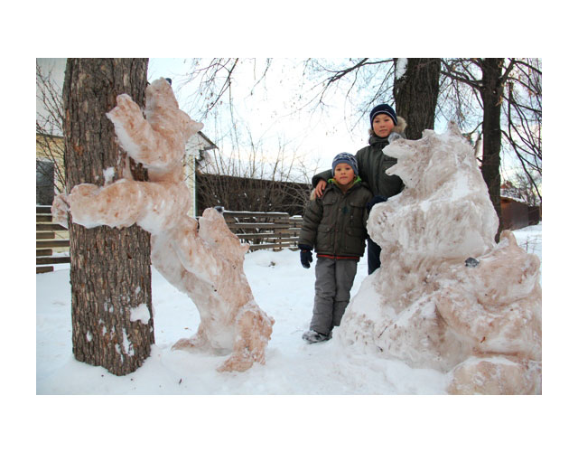 Так, в городе Березовском местный житель вместе с сыновьями слепил из снега целую композицию – медведицу с тремя детенышами. Один медвежонок сидит рядом с матерью, другой с помощью третьего «забирается» на дерево. Как пишет березовская газета «Золотая горка», для создателя медведей сложнее всего было сделать их лица. «Звериные головы пришлось переделывать по несколько раз. Зато сейчас на лицах косолапых застыла дружелюбная улыбка», – сообщает издание. Медведей решили не оставлять белыми, а покрыть краской. Правда, из-за того, что краска впиталась в снег, звери все-таки выглядят не бурыми, а скорее какими-то облезлыми.