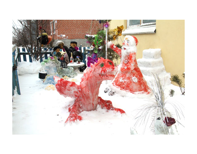 А вот другая жительница все того же Березовского изваяла из снега и вовсе довольно-таки пугающего зверя. Во дворе многоэтажного дома березовчанка вылепила дракона. У мифического существа страдальческое выражение лица, а покрашен он красной краской. Выглядит это так, как будто дракон истекает кровью. В таких же «кровоподтеках» и расположенный рядом Дед Мороз. Компанию снеговику и дракону составляет символ 2013 года по восточному календарю – змея, матрешки и автомобиль с эмблемой хоккейного клуба «Автомобилист», сообщает nr2.ru