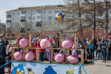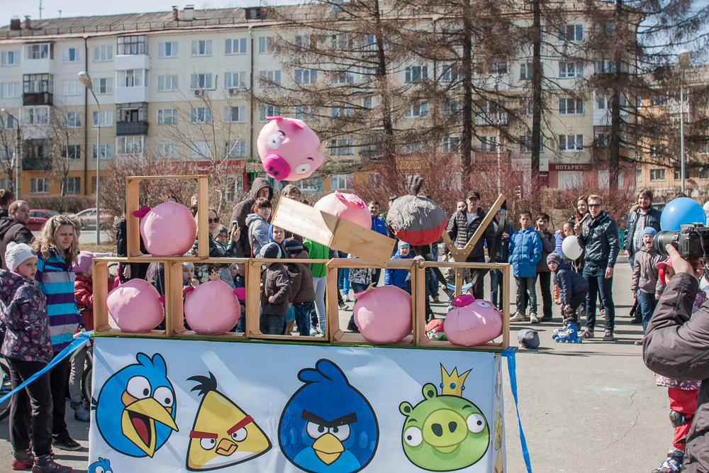 В центре города прошел турнир по мотивам известной игры. Более сотни жителей Первоуральска приняли участие в первом дне чемпионата по стрельбе из гигантской рогатки. Центральная площадь города была оформлена по аналогии с известной игрой Angry Birds. Недалеко от фонтана организаторы установили на зеленом газоне двухметровую рогатку, а также построили из домиков конструкцию, в которой поселились розовые хрюшки.