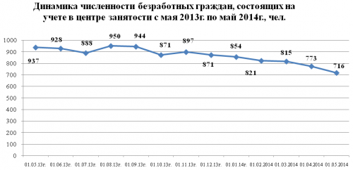 Численность безработных граждан, состоящих на учете в центре занятости, на 1 мая 2014 года 716 чел.;