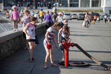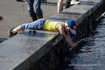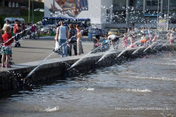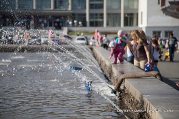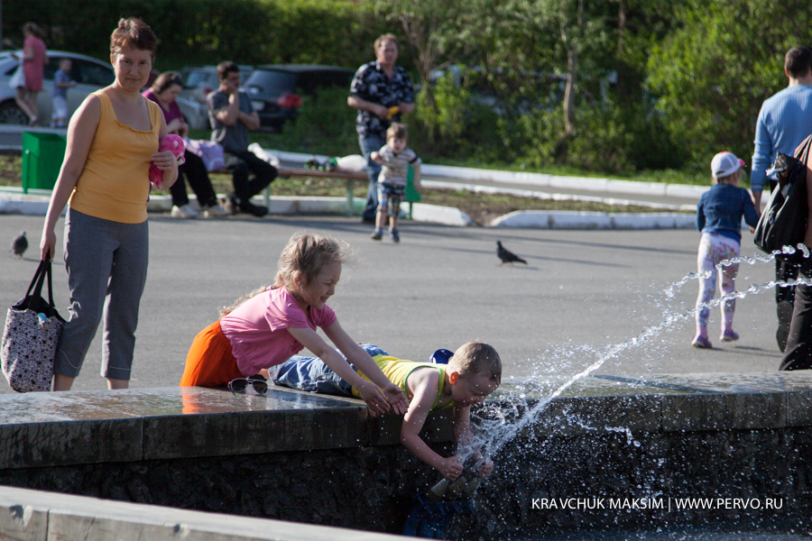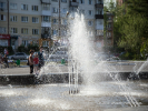 Фонтан на площади Победы заработал в пятницу в 18.00. Сейчас возле него уже очень много веселых детей. Наиболее шустрые уже норовят схватить струю воды руками.