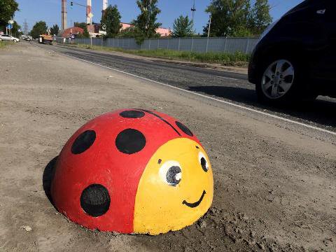 Бетонные основания, раскрашенные под божьи коровки, появились на разделительной полосе дороги в районе Талицкого моста. Их предназначение – препятствовать выезду за пределы проезжей части и нарушению правил движения. Восемнадцать кругляшей работники МПО ЖКХ разместили с равным интервалом.