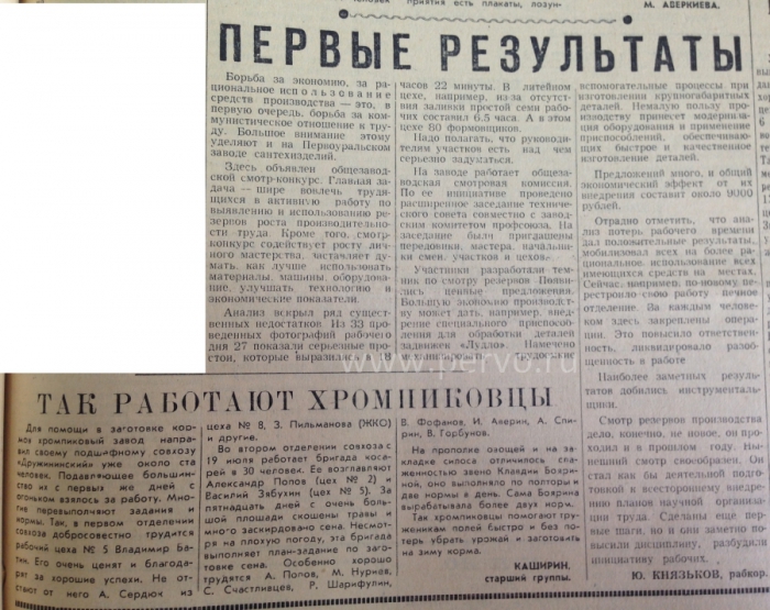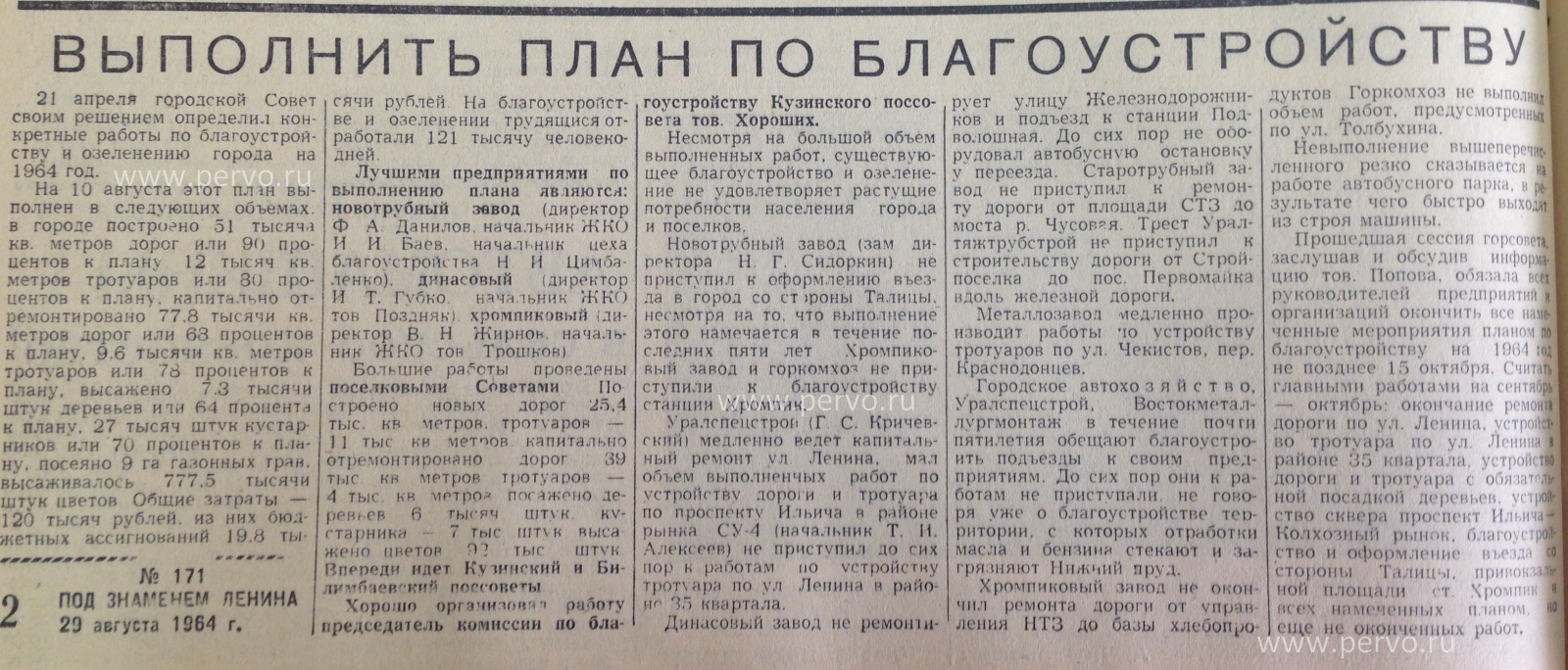 Новотрубный завод (зам директора Н.Г.Сидоркин) не приступил к оформлению въезда в город со стороны Талицы. Несмотря на то, что выполнение этого намечается в течение последних пяти лет. Хромпиковый завод и горкомхоз не приступил к благоустройству станции Хромпик.