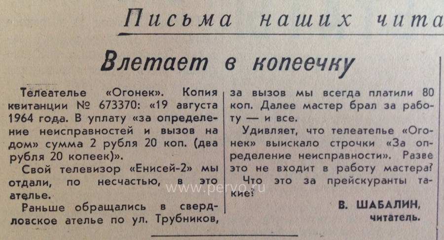 Телеателье «Огонек». Копия квитанции №673370: «19 августа 1964 года. В уплату «за определение неисправностей и вызов на дом» сумма 2 рубля 20 коп. (два рубля 20 копеек)».