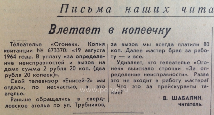 Раньше обращались в свердловское ателье по ул.Трубников, за вызов мы всегда платили 80 коп. Далее мастер брал за работу – и все.