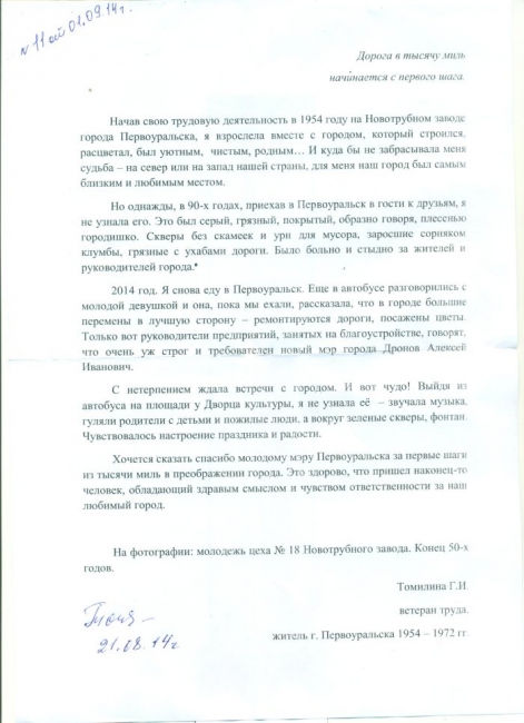 Первоуральск становится краше. Каждый день мы с вами видим, как ремонтируются дороги, преображаются скверы и аллеи, строятся детские площадки и благоустраиваются городские дворы. За ежедневной рутиной, возможно, мы многого не замечаем, а что-то становится для нас уже обычным делом. Но человек, который в городе не был давно, замечает каждое позитивное изменение. Как Г. И. Томилина - автор письма в городскую газету «Вечерний Первоуральск». Она, родившаяся в Первоуральске, время от времени навещает родной город. О своих впечатлениях жительница уже Санкт-Петербурга в письме рассказала газете: