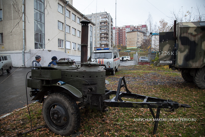 Первоуральская городская служба спасения развернула вместительные брезентовые палатки, в которых люди перед посадкой в автобусы или пешим маршем смогут получить горячее питание. Рядом дымит труба полевой кухни, в которой варится солдатская гречневая каша и булькает кипяток для чая.
