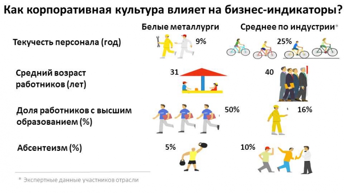 О том, что корпоративная культура компании имеет благоприятное влияние на финансовые и бизнес-показатели, говорят следующие, приведенные членом Совета директоров ЧТПЗ в выступлении, факты: в цехах Белой металлургии текучесть персонала составляет 9% в год, абсентеизм – 5%, в то время как в целом по отрасли – 25%[1] и 10% соответственно. На предприятиях Белой металлургии стремятся работать лучшие специалисты: доля сотрудников с высшим образованием в «белых» цехах ЧТПЗ – 50%, по отрасли – 16%; средний возраст белых металлургов – 31 год, по отрасли – 40 лет. На данном этапе внедрение Белой металлургии реализуется в «черных» цехах трубных заводов группы ЧТПЗ, в дальнейшем философия Белой металлургии будет распространяться на все предприятия и компании группы.