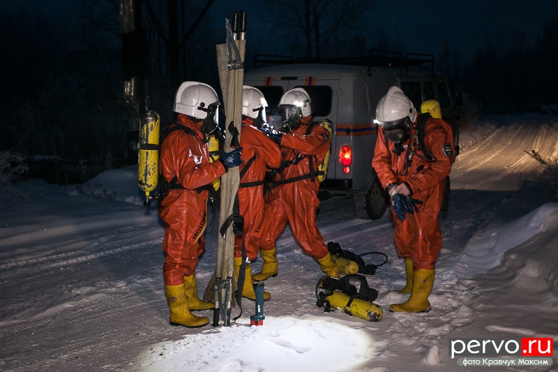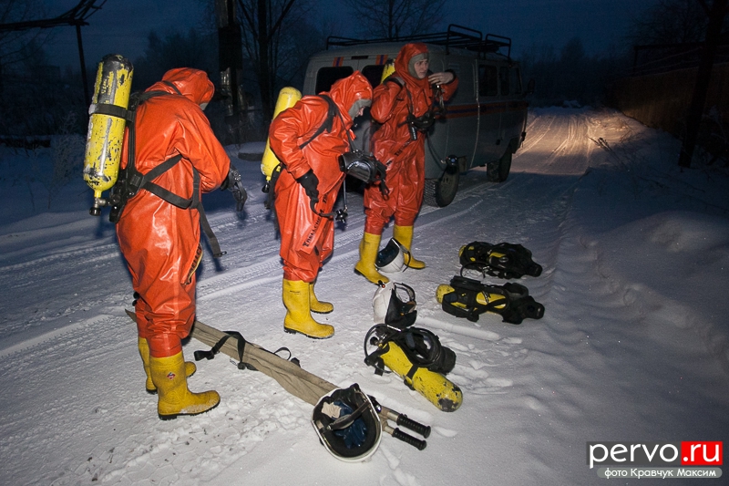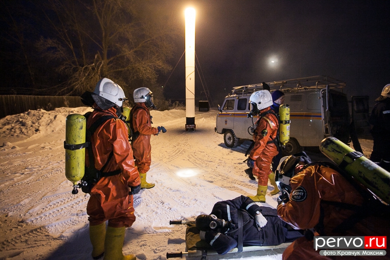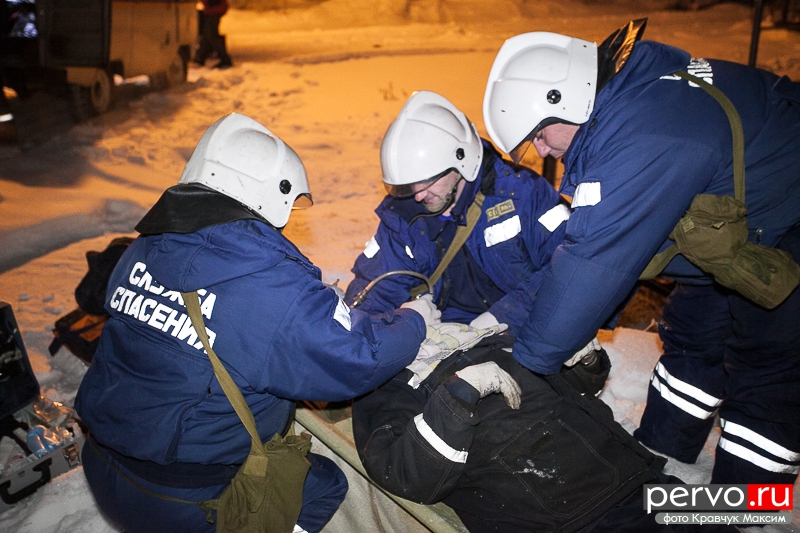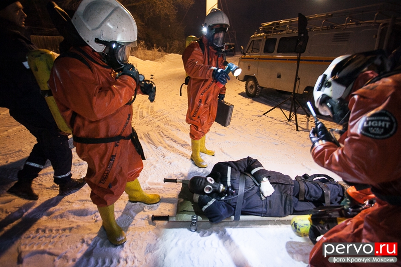 На место аварии прибыли спасатели, сотрудники МЧС, работники «Водоканала». Пострадавшего спасатели выносят спустя несколько минут после утечки хлора.