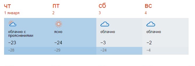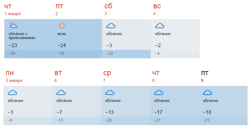 Прогноз погоды на предстоящие праздники катаклизмов не обещает. Вслед за первыми в году холодными деньками, когда температура воздуха опустится до 29 градусов со знаком минус, вновь придет потепление. Больших снегопадов в новогодние каникулы синоптики также не обещают.