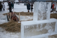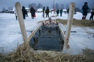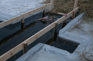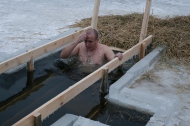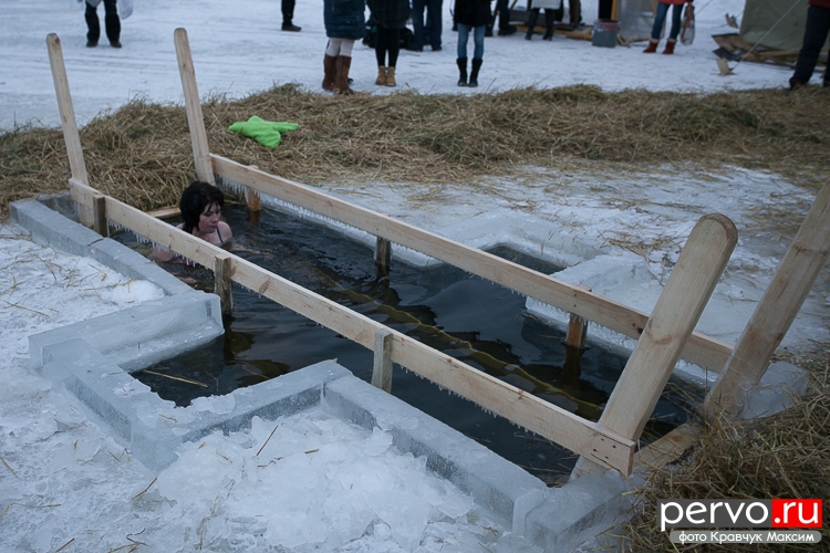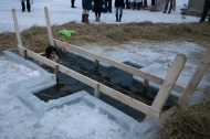 Возле купели стоит большая теплая палатка, разделанная на две части. В ней мужчины и женщины могут переодеться, не смущая друг друга. От палатки до купели выложены дорожки из сена, чтобы люди не заморозили на льду ноги. Сама купель оборудована деревянными ступенями для спуска в воду и перелами.