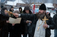 Воду в купели освящает настоятель Свято-Троицкого храма отец Михаил. Всех присутствующих он окропляет освященной водой. И обращается со словами краткой и доброй проповеди, рассказывающей историю праздника.