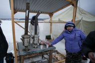 Рядом с армейской палаткой на столе кипят два самовара. Любой желающий может согреться стаканом горячего чая.Лица у людей, пришедших к иордани красные от ветра, но веселые. Рядом с купелью дежурят сотрудники МЧС. На всякий случай стоит машина Скорой помощи.