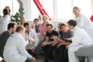 Для знакомства с будущими белыми металлургами Константин Райкин и декан актерского факультета Высшей школы сценических искусств Елена Бутенко-Райкина привезли на Урал группу студентов второго курса. Начинающие актеры показали лучшие фрагменты своего спектакля «ДомМарРощенное» – «Дом в Марьиной роще». В свою очередь студенты Образовательного центра ЧТПЗ представили творческий номер, придуманный для поздравления своих коллег по цеху с профессиональным праздником – Днем металлурга.
