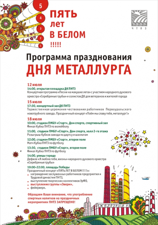 Кульминация празднования - яркие театрализованные концерты - пройдут в пятницу и в субботу: 17 июля на стадионе «Восход» в Челябинске и 18 июля на площади Победы в Первоуральске. Здесь состоится награждение победителей корпоративного конкурса «Трудовая династия», чествование «Заслуженных работников», выступление творческих коллективов Урала. Специальным гостем праздника станет группа «Звери», девятикратно признанная «Лучшей рок-группой» по версии Муз-Тв. Музыканты исполнят свои лучшие хиты и новые композиции. Завершится концерт традиционным красочным фейерверком.