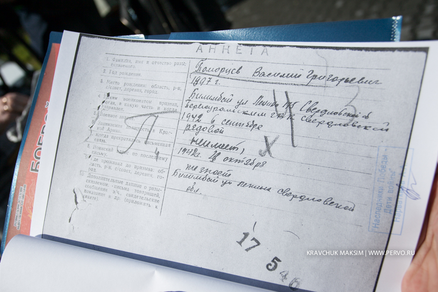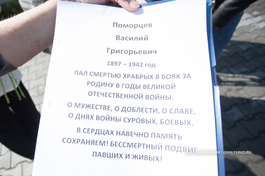 В Первоуральске в общественную организацию «Наследники Победы – Дети войны» обратилась Парфенчик Татьяна Викторовна. Она просила помочь прояснить ситуацию: в мае 2015 года к 70-летию Великой Победы, в Билимбае была проведена реконструкция мемориала Славы павшим в Великой отечественной войне героям-билимбаевцам. И как оказалось, после реконструкции, Татьяна Викторовна не обнаружила на мемориале фамилию своего деда, Поморцева Василия Григорьевича, работавшего в Билимбаевкой больнице, и пропавшего без вести в годы ВОВ.