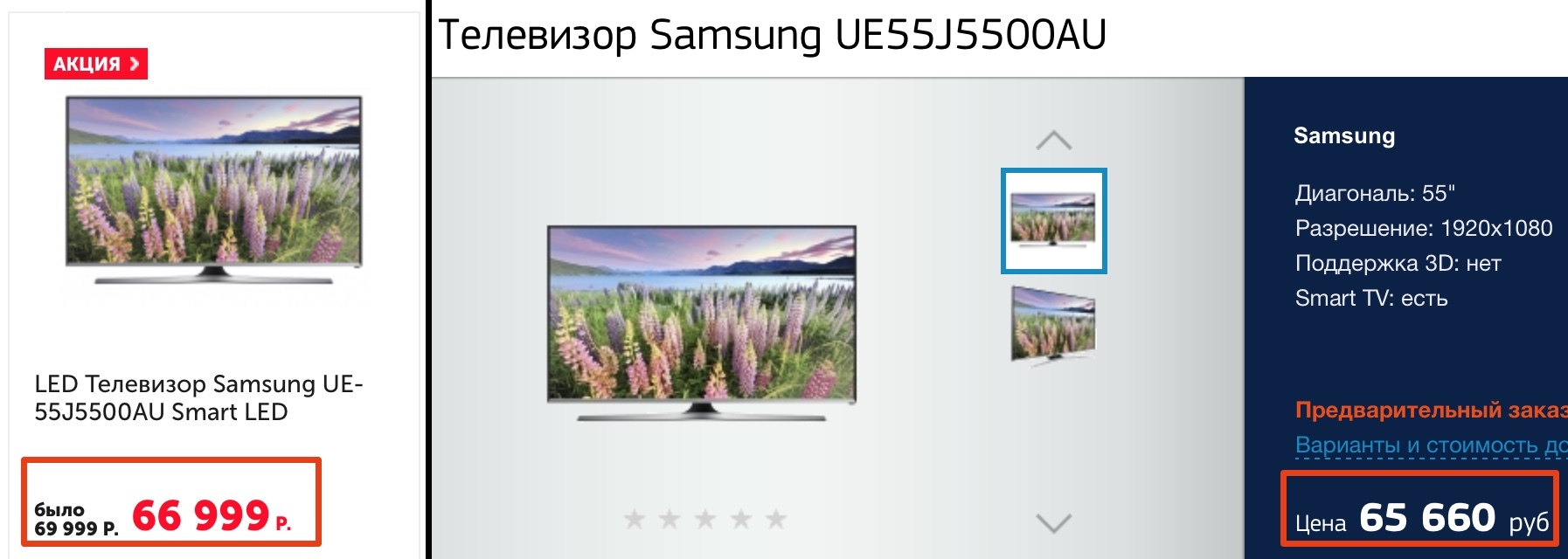 Крупный ритейлер закатил «Новогоднюю распродажу», где покупатели могут приобрести не самый ходовой товар с небольшими скидками. Если же говорить об интересных позициях, то тут нас поджидал очередной подвох — телевизор Samsung, который стоил 69 999 рублей, стал на 3 тыс. дешевле, но все еще остался на 1240 рублей дороже, чем у конкурента.