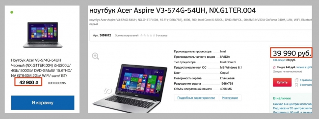Невероятно «щедрое» предложение особенно расстраивает на фоне того, что некоторые ноутбуки у ритейлера оказались значительно дороже, чем у конкурентов! Например, Acer V3-574G-54UH стоит 42 900 рублей, а в соседнем интернет-магазине такой же гаджет оценен в 39 990 рублей!