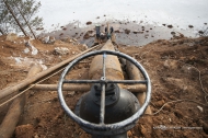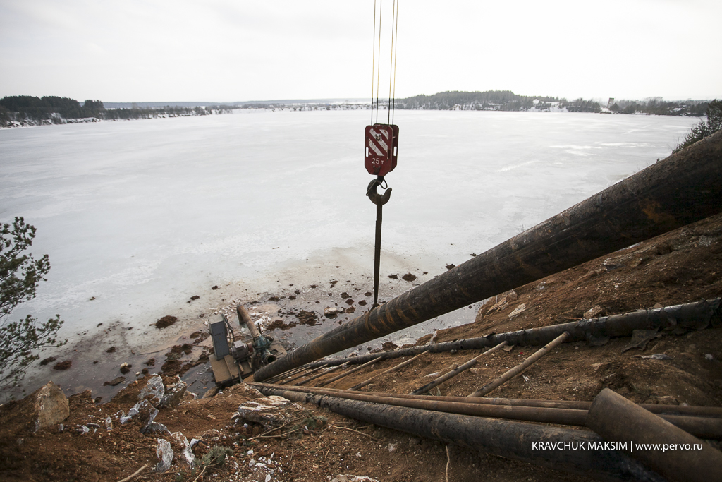 Труба протяженностью около 300 метров и диаметром в полметра оборудована мощным электронасосом. Ее конец уходит под лед на глубину пяти метров. Глубина карьера - около 75 метров, но чтобы не топило погреба и огороды жителей микрорайона Доломитовый, достаточно понизить уровень воды на 4 метра, а не осушать карьер до самого дна. Работу по монтажу системы откачки воды выполнили работники ПМУП «Водоканал», они будут обслуживать ее и в дальнейшем.